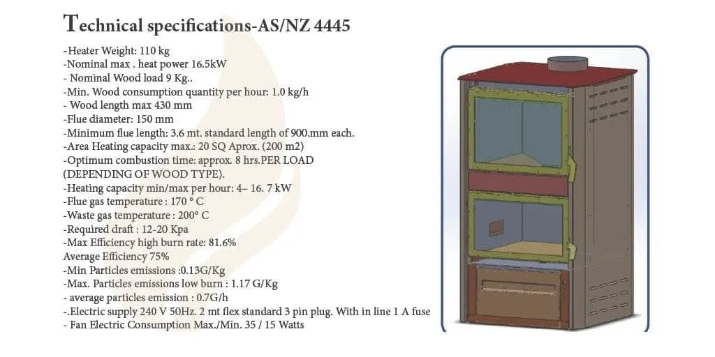 ECO-TWIN boasts the cleanest combustion with a maximum efficiency of almost 90% and a maximum power output of over 17 Kw, this will easily heat houses of over 25 squares (equivalent to 232 sqm). ECO-TWIN has a very quiet fan that is automatically modulated to change according to the heater's temperature. This heater is fully tested and certified to Australian Standard AS/NZS 4012-4013.